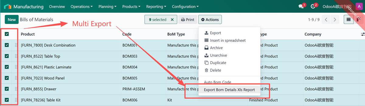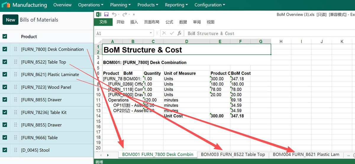 - 2. Multi Bom export in one excel file, Bom per sheet.多个BoM导出至同一文件